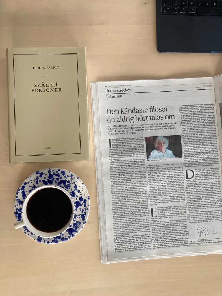 Idag kan man läsa om Derek Parfits moderna klassiker ”Reasons and persons” i Svenska dagbladet. Det är Vincent Flink Amble-Naess har läst vår översättning ”Skäl och personer”, och även Dave Edmonds biografi, ”Parfit”, som kom på engelska för några månader sedan och som kommer på svenska på Fri tanke förlag till våren.